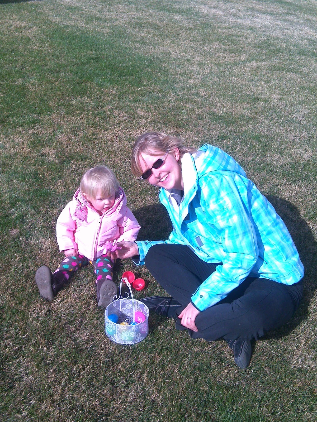 After the little kids were done we went to play on the swings while the big kids raced around us picking up eggs! She thought this was soooo cool!
